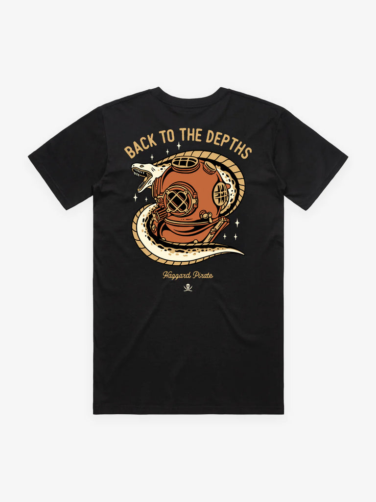 Take the plunge with the Deep Diver tee. Featuring our hand-drawn vintage diver helmet wrapped by a fierce moray eel, this graphic channels the raw grit of the sea with a bold “Back to the Depths” motto. Printed on a 4.7 oz buttery-soft cotton tee in classic black, it’s lightweight, durable, and built for everyday wear—whether you’re above deck or fifty fathoms down.