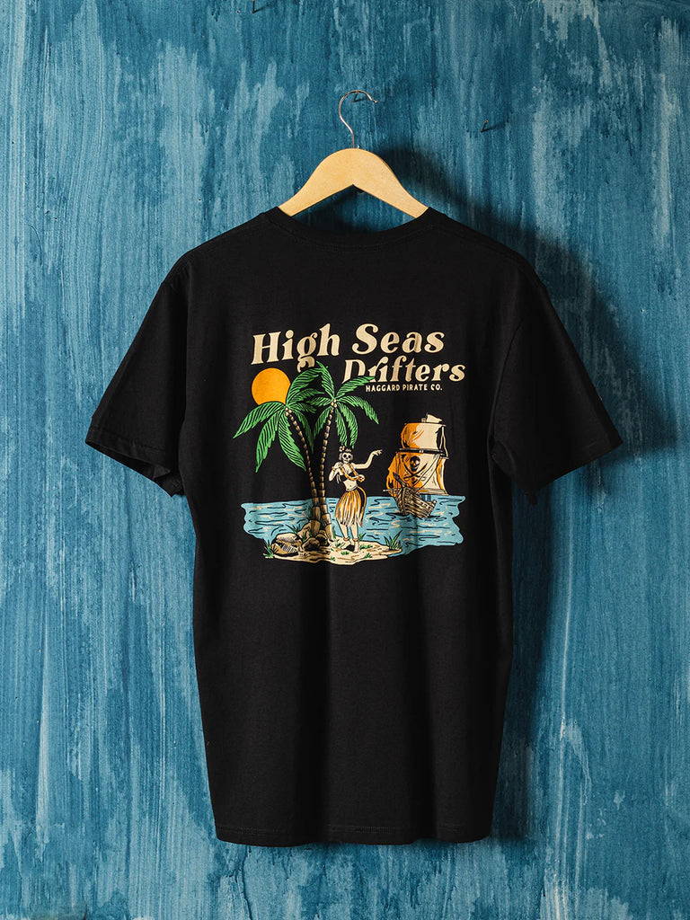 Drift into the unknown with the High Seas Drifter tee. Showcasing hand-drawn artwork of a hula dancer, swaying palms, and a pirate ship slipping toward the horizon, this graphic captures the untamed spirit of life at sea. Printed on a 4.7 oz buttery-soft cotton tee in coal black, it’s lightweight yet durable—made to keep up from sunrise casts to last-call nights ashore.