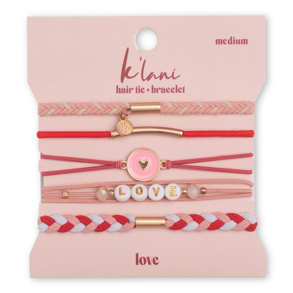 Our Love set is a fun mix of pinks and reds. Each set includes 5 hair tie bracelets. Made for comfort and style, it blends fashion with function, wear it on your wrist