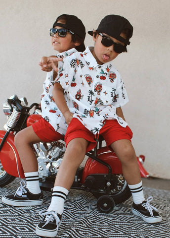 This crisp and colorful white button up turns all things LT into classic Americana flash. Think tattoo parlor meets ice cream run — cherries, flames, panthers, and palm trees. This shirt is INSANELY soft and lightweight with the perfect amount of stretch meaning no one getting hot or uncomfortable. Who said traditional formal wear had to be boring?